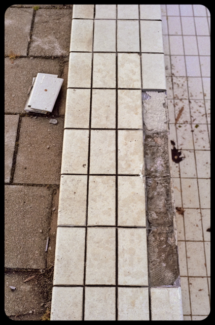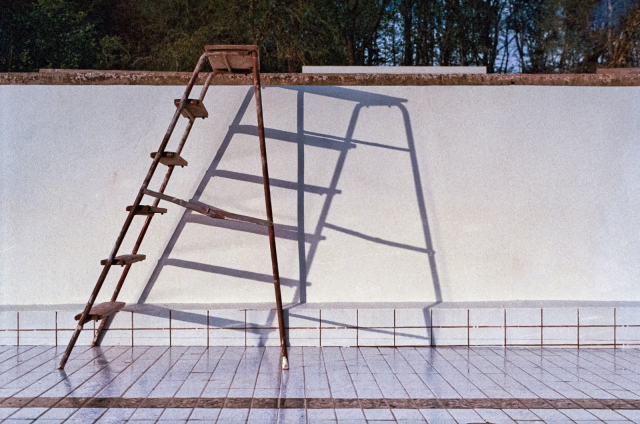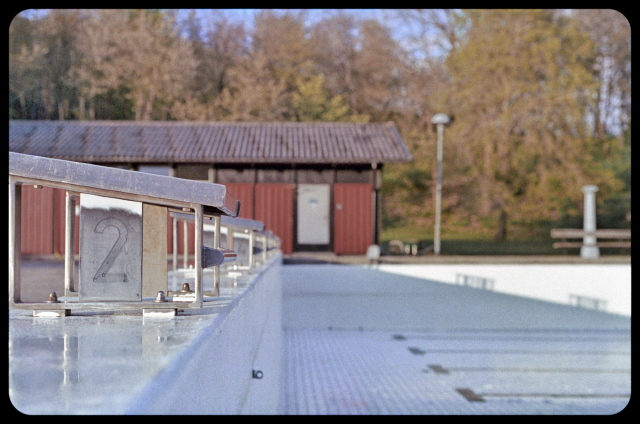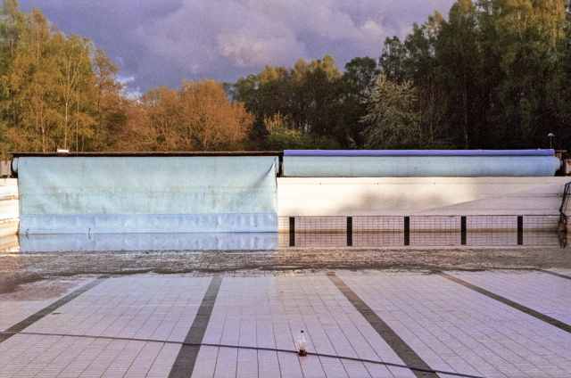 Bakom badplatsens  glättiga fasad döljer sig ett slitet innankrom. Bassängens kakel har spruckit och ligger löst utspritt. Barnens fontän står där och tittar lite förvånat. Vad sker då dörrarna stängs, säsongen är över? Vattnet tappas ur och gästerna har gått i ide. Den lilla grodan simmar runt i det lortiga vattnet som precis täcker botten.